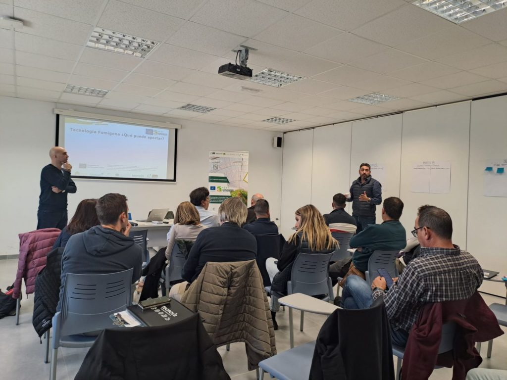Posteriormente, se llevó a cabo un taller en el que se presentaron y debatieron los progresos del proyecto LIFE NextFUMIGREEN. Durante la sesión se abordaron temáticas fundamentales relacionadas con las soluciones tecnológicas y sostenibles que propone el proyecto. Se detallaron innovaciones clave como la microdispersión seca y los biopesticidas, así como los ensayos de desinfección realizados en el marco del proyecto.